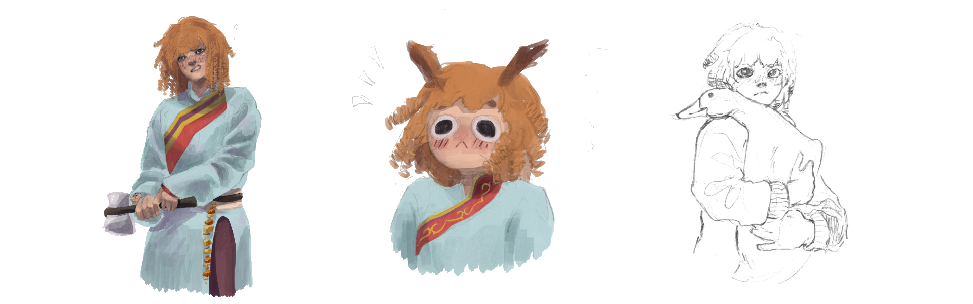 more calm and reserved than the two others, she brings a mediation. orphan from unknown parents, she was found by azmael as a kid and they look up at each other as siblings.